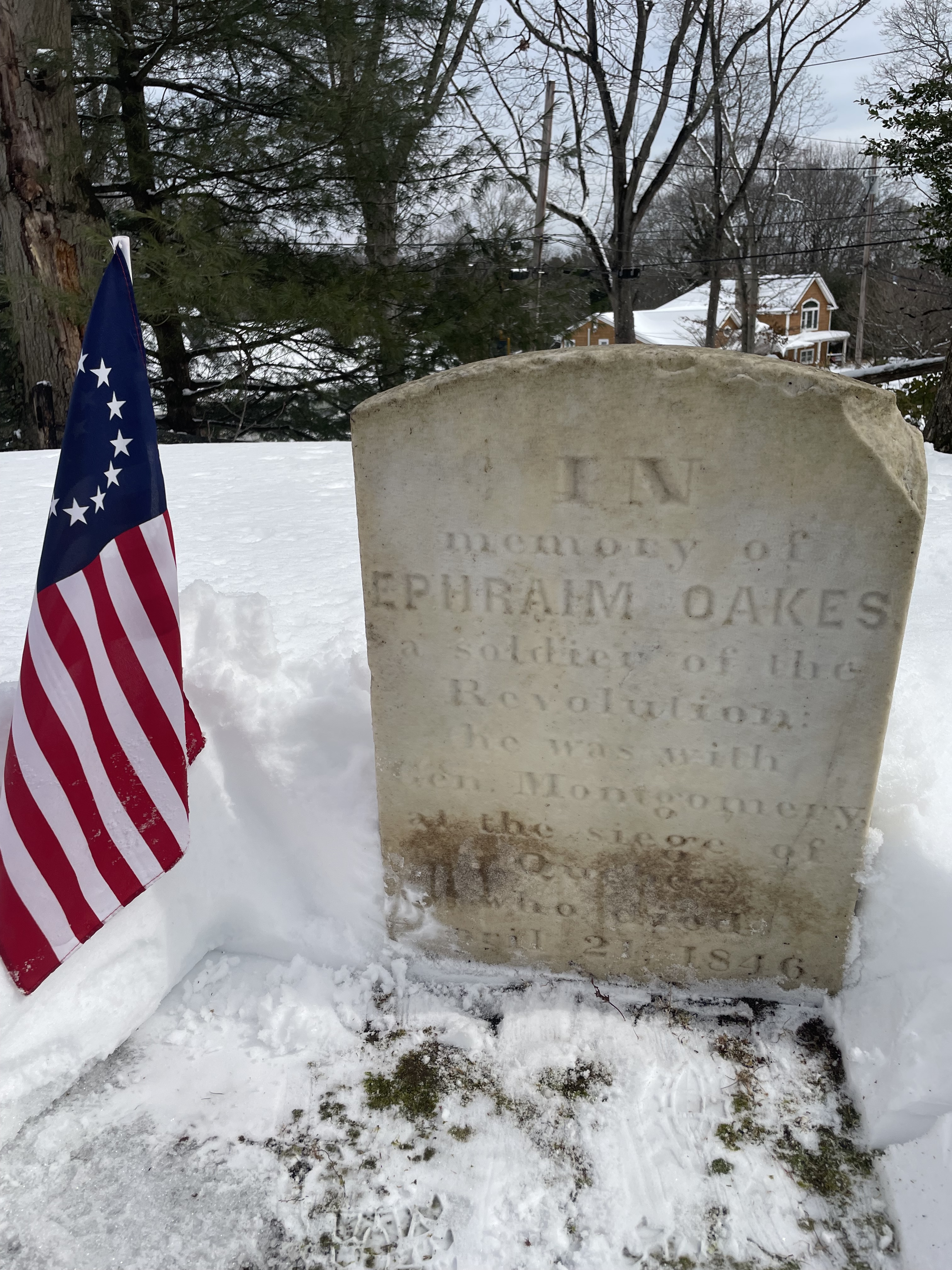 Ephraim Oakes was 22 years old when he “took a tour into Orange County in the Town of Goshen.” While there, a call for soldiers was issued and he enlisted for a five-month tour of duty in the Third New York Regiment under Colonel James Clinton around June 1, 1775. At around the time George Washington assumed command of American troops surrounding Boston, the Continental Congress authorized an invasion of Canada to forestall a British invasion of the rebellious colonies from the north and to try to convince the French settlers to join the fight against the British. The invasion force was made up mostly of New York and Connecticut troops under the command of General Philip Schuyler. Oakes and his fellow recruits marched to Albany and then to Lake Champlain. General Richard Montgomery assumed command when Schuyler fell ill. At the beginning of September, they arrived at Fort St. John, about 22 miles from Montreal. After a six-week siege, the fort fell. The Americans next captured Montreal in mid-November. By this time, Oakes’ enlistment had expired, but he re-enlisted for another six months.