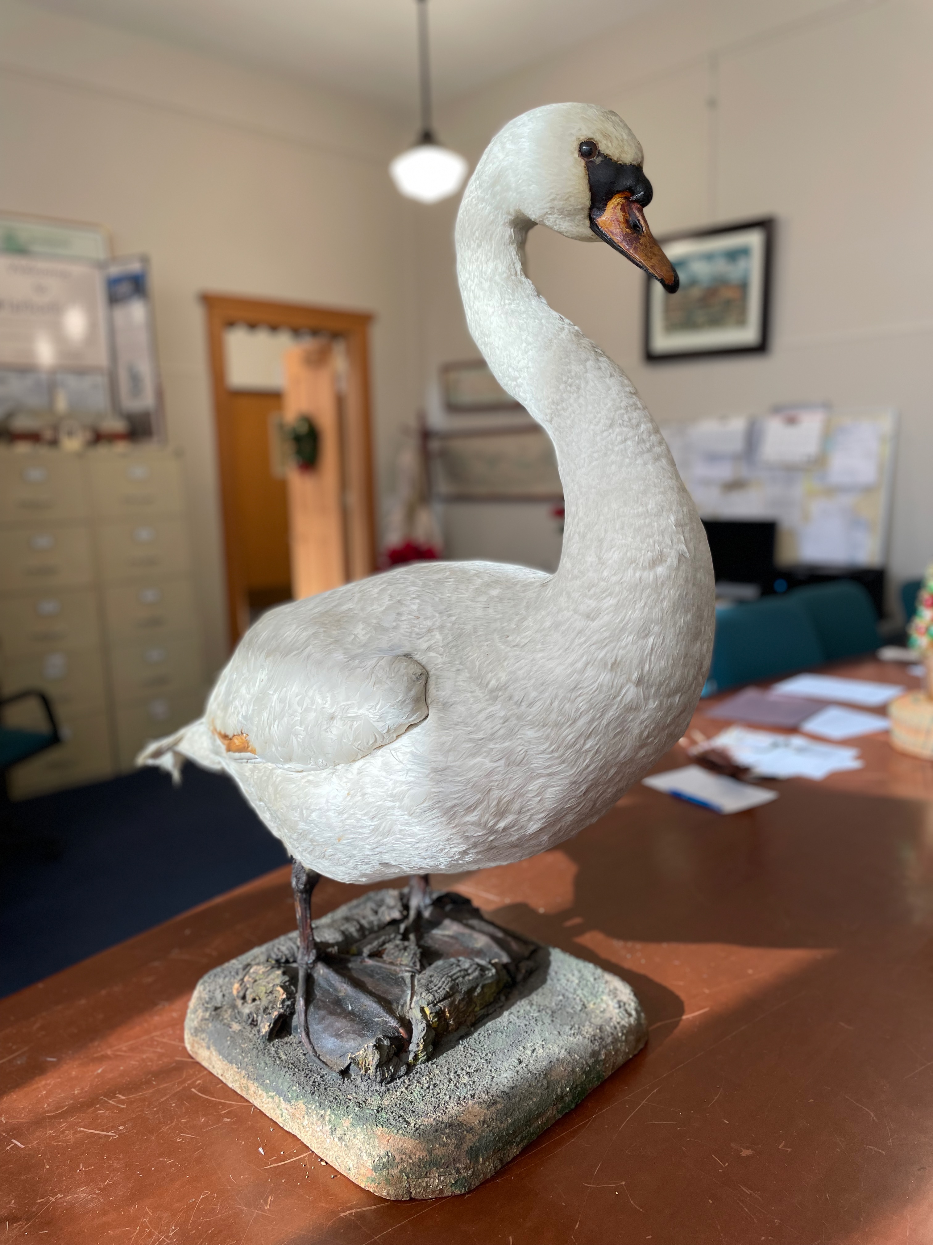 Tom is now at the Greenlawn-Centerport Historical Association’s office in the Harborfields Library. Last month, a Greenlawn resident asked Deanne Rathke, the executive director of the association, if she knew about Old Tom.  She did.  The gentleman returned the next day with Tom himself.  He explained that he purchased the taxidermied swan some time between 1969 and 1971 at an auction held by the Huntington Historical Society.